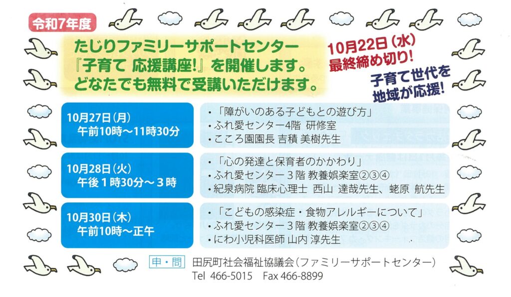 たじりファミリーサポートセンター養成講座の内、公開講座3講座は登録に関わらずどなたでも受講していただけます!